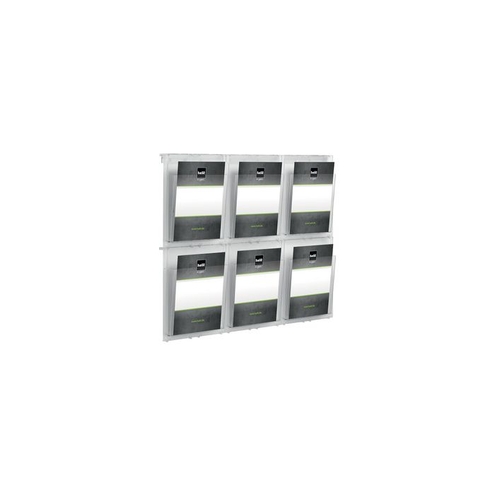 helit Porte-brochures mural "the placativ", transparent 6x A4 portrait, en polystyrène, dimensions d'un compartiment(L)245 x (P)35 x (H)235 mm, extensible horizontalement et verticalement, dimensions: (L)852 x (P)54 x (H)652 mm, contenu: 6 porte-brochures, rail de montage & connecteur (H6812002)