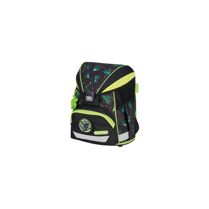 herlitz Cartable UltraLight XL Plus "Jungle Explorer" polyester, dos rembourré ergonomique, matériau en partie réfléchissant, bretelles et sangle de poitrine réglables, fermoir à clic, 1 écusson et 1 pendentif en feutre, incl. étui scolaire, trousse et sac de sport (nouveau: 400197517 / ancien: 50048953) dimensions: (L)280 x (P)220 x (H)370 mm, volume: 22 L couleur: noir/vert, motif: jungle, panthère