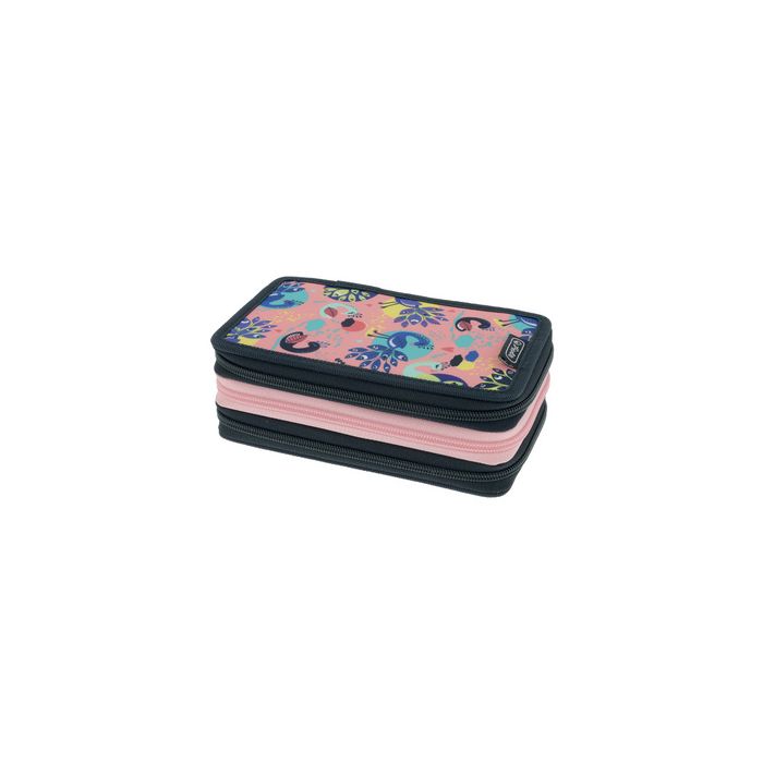 herlitz Étui scolaire TriCase "Fancy Peacock", 31 pièces en polyester, étui scolaire en 3 parties, 3 fermetures à zipde couleur, doublure colorée, garni de 31 pièces, (nouveau: 300001484 / ancien: 50043392) garni de: stylo à bille, règle pochoir, feutres, crayons de couleur, crayons à papier, taille-crayon, gomme, règle, équerre, mini-rapporteur
