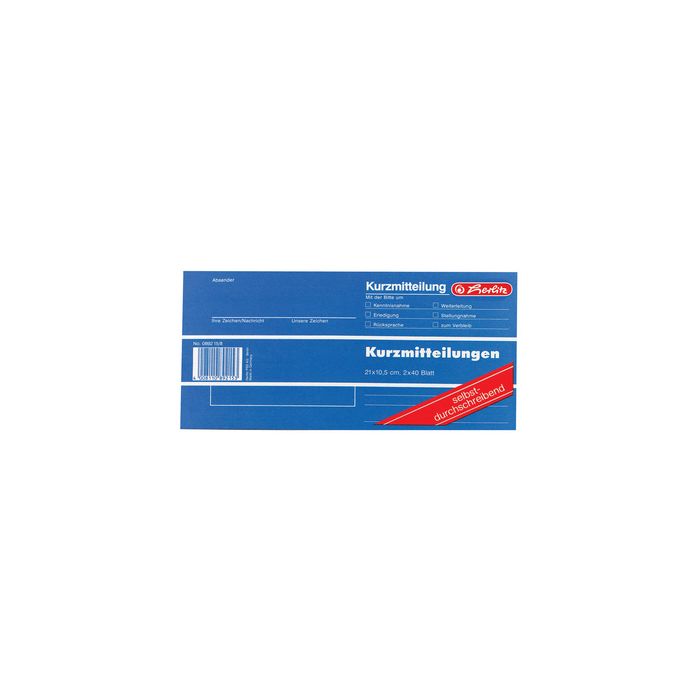 herlitz Formularbuch "Kurzmitteilung", 1/3 A4 quer ------------- für den Markt: D / L / A / CH ----------------50 Blatt, holzfrei, 210 x 105 mm, geblockt, ohne Deckblatt (neu: 300010525 / alt: 00892109-001)