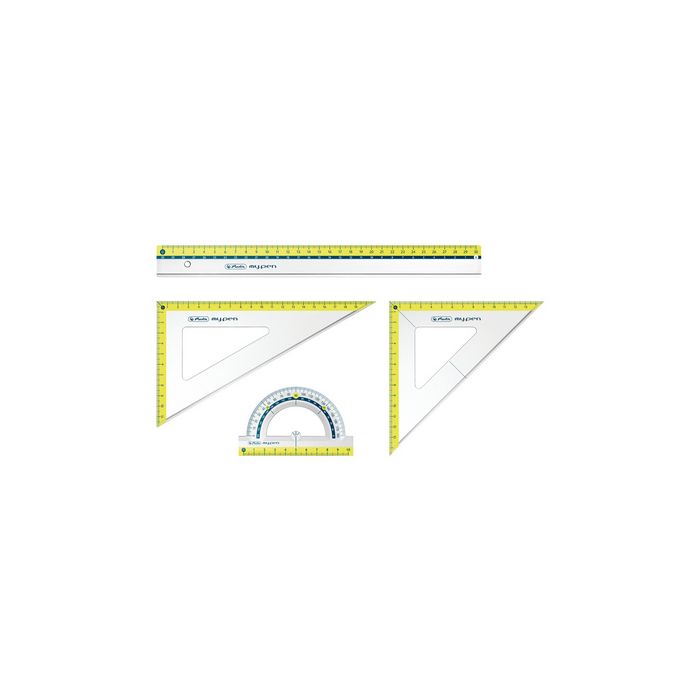 herlitz Kit de géometrie my.pen, 4 pièces, assorti en plastique, matériau résistant à la casse, contenu: 1 règle 300 mm, 1 rapporteur 100 mm, 2 équerres, dans un emballage transparent, couleurs assorties - pas de choix de couleur possible (nouveau: 300003412 / ancien: 11368222)