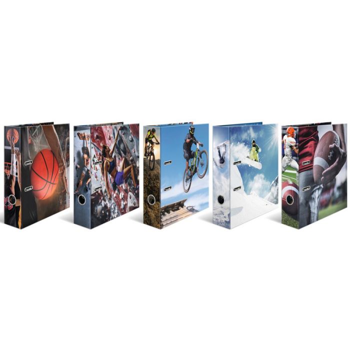 HERMA Classeur à motif "Sport", A4, largeur du dos: 70 mm carton solide, intérieur imprimé, toucher particulier grâce à la finition texturée, trou de préhension, couverture avant/arrière imprimée, mécanisme à levier, presse-feuilles contenu: 5 pièces assorties en 5 motifs (20104)