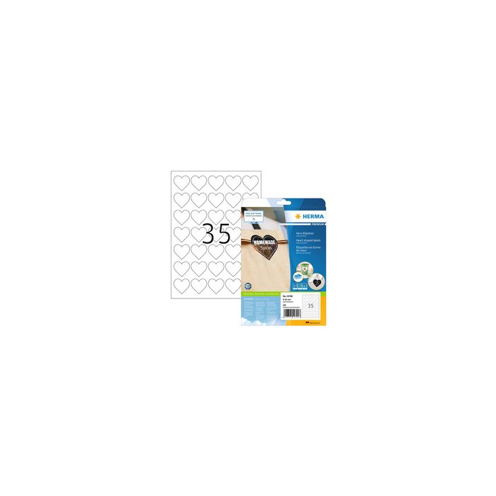 HERMA Étiquette en forme de coeur, diamètre: 35 mm, blanc pré-poinconné sur des feuilles A4, en papier, auto-adhésif, adhère de façon permanente, imprimable pour imprimante à jet d'encre, laser et photocopieur contenu: 350 stickers coeur sur 10 feuilles A4 (10790)