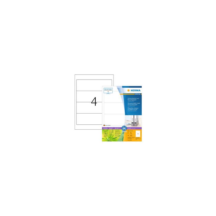 HERMA Étiquette pour dos de classeur recyclée, 192 x 61 mm, 80 feuilles, blanc naturel, court/large, papier recyclé, auto-adhésif, imprimable, adhère de façon permanente pour imprimante à jet d'encre, laser et photocopieur contenu : 320 pièces sur 80 feuilles A4 (10740)
