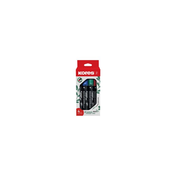 Kores Marqueur permanent "ECO XP2", pointe biseautée, étui épaisseur du trait: 3-5 mm, sèche rapidement, peut rester longtemps ouvert, plastique recyclé à 80%, sans xylène, benzène ni toluène, assorti en noir, bleu, vert, rouge, contenu: 4 marqueurs (M20784)