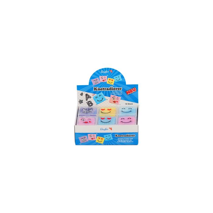 Läufer Gomme souple visages, en présentoir de 18 boîte transparente avec impression de smiley, gomme souple, dimensions: (L)35 x (P)40 x (H)13 mm, assorti en différentescouleurs et motifs de visages paquet de 18 gommes (12427)