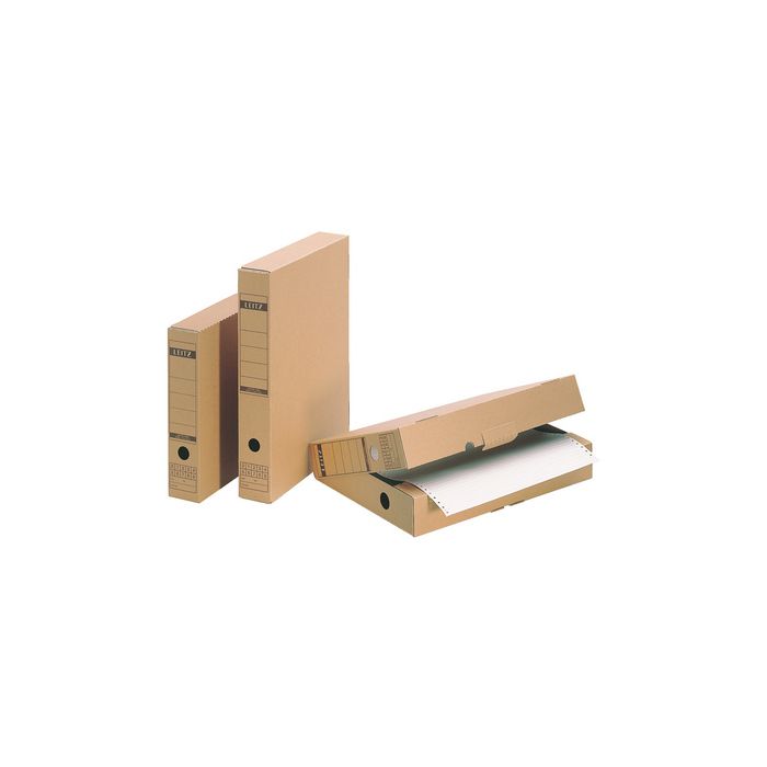 LEITZ boîte à archives avec languette de fermeture, format A3, en carton ondulé, brun du nature, contrecollé de papier natron, pour dessins, plans ou listings informatiques jusqu'à 420 mm x 30,48 cm (12"), s'ouvre comme un livre, en paquet de 5 pièces (6085-00-00) anneau de préhension et impression d'archivage pour formats portrait et paysage dimensions: (L)70 x (P)325 x (H)437 mm