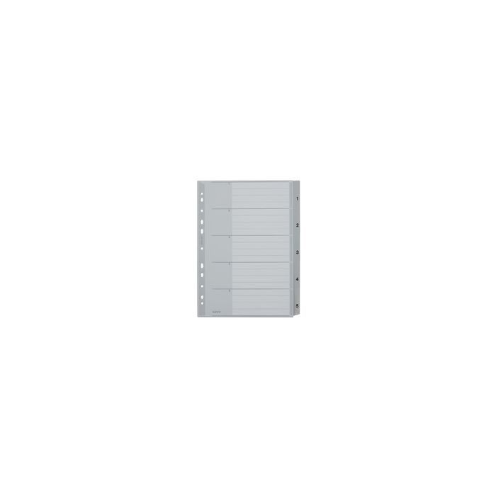 LEITZ Intercalaires en plastique, numéroté, format A4 extra large, 1-5, gris, 5 touches, en PP, 0,12 mm, avec une couverture personnalisable en carton (250 g/m2), onglets imprimés, modèle Premium, perforation Euro, dimensions: (L)238 x (H)297 mm (1283-00-85)