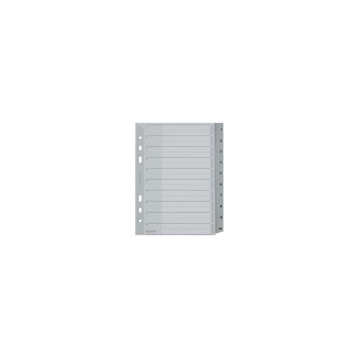 LEITZ Intercalaires en plastique, numéroté, format A5,1-10 en PP, 10 touches, gris, une couverture personnalisable en carton (250 g/m2), onglets imprimés, modèle Premium, perforation Euro, dimensions: (L)165 x (H)210 mm (1285-00-00)