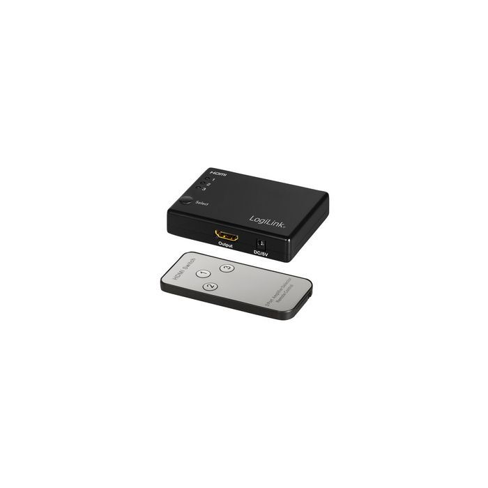LogiLink Commutateur Full HD Small HDMI, 3 ports, noir entrée: 3x fiche femelle HDMI-A, 1x prise jack femelle 3,5mm1x entrée de courant DC, 1x DC-Plug, sortie: 1x fiche femelle HDMI-A, boîtier en ABS, avec télécommande, récepteurinfrarouge, dimensions : (L)80 x (P)58 x (H)18 mm (HD0042)