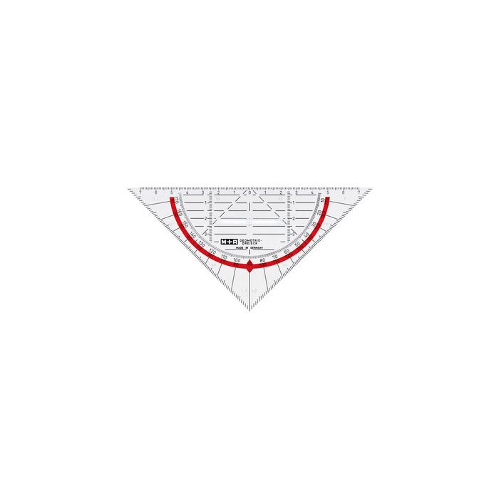 M+R Equerre géométrique, verre acrylique, hypoténuse: 160 mmtransparent, échelle de degrés opposés, en surbrillance rouge, dans un sachet en papier (723170040)
