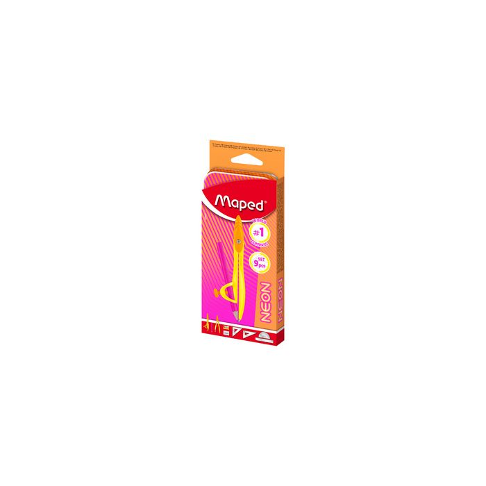 Maped Coffret de géométrie Mathset STUDY NEON, 9 pièces Contenu: 1 compas avec bague, 1 compas sans bague, 1x crayon à papier, 1x règle plate 150 mm, 1x taille-crayon,1x gomme, 1x rapporteur 180 degrés, 1x équerre 45 degrés, 1x équerre 60 degrés, dans une boîte en métal (199501) assorti dans les couleurs rose néon et orange néon, pas de choix de couleur possible !
