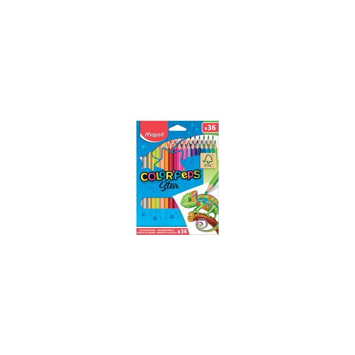 Maped Crayon de couleur COLOR'PEPS Star, étui carton de 36 triangulaire, mine douce et résistante, tige de la couleur du tracé, épaisseur de la mine: 2,9 mm, couleurs assorties contenu : 36 crayons (832017) assorti dans les couleurs noir, gris, chocolat, marron, gaiadune, jaune soleil, jaune citron, orange, ton chair, rouge, rouge fraise, rouge clair, rouge grenadine, fuchsia, violet,aubergine, rose, bleu foncé, bleu acier, bleu, marshmallow, bleu nuit, bleu marine, vert d'eau, jade, vert kiwi, vert jungle, vert, vert pomme, blanc, or, argent, rose fluo, jaune fluo, orange fluo