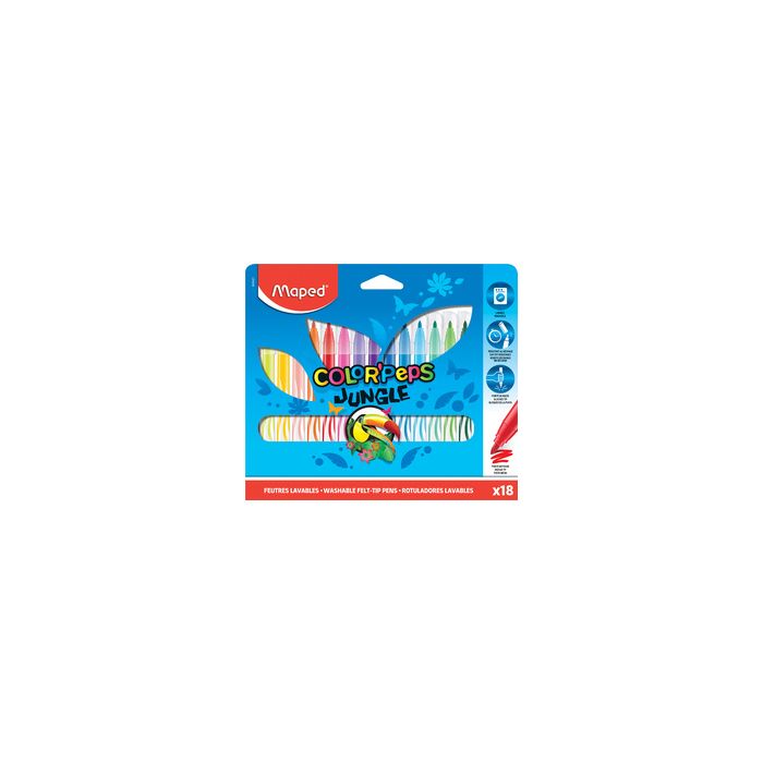 Maped Feutre COLOR'PEPS Jungle, étui en carton de 18 largeur du tracé: 1,5 mm, pointe résistante, capuchon ventilé, facilement lavable, avec description de la couleur sur chaque feutre contenu: 18 pièces (845421) couleurs assorties: noir, gris, marron foncé, marron clair, vert, vert pomme, jaune, jaune soleil, orange, rouge,rouge framboise, rose, lilas, violet, bleu clair, bleu, bleu marine, vert jade