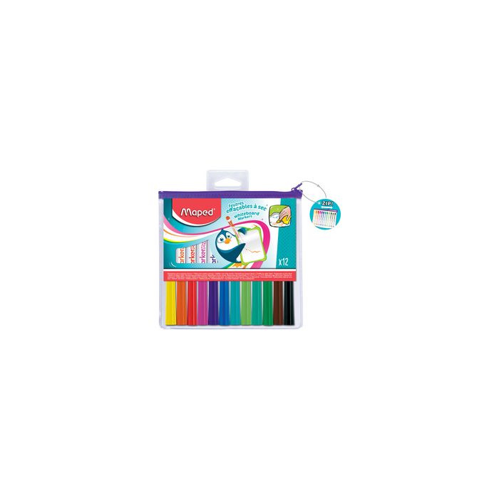 Maped Marqueur pour tableau blanc Marker'Peps, étui de 12 pochette à fermeture Zip, largeur de tracé: 1,5 mm, pointe ronde, forme ergonomique, effaçable à sec, corps blanc, bouchon à la couleur de tracé, couleurs assorties contenu: 12 crayons (741817) assorti dans les couleurs noir, marron, vert, vert clair, vert émeraude, jaune, orange, rouge, rose, violet,turquoise,bleu