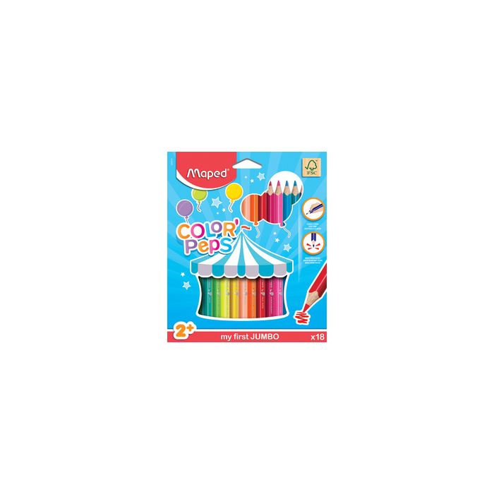 Maped my first Crayons de couleur COLOR'PEPS JUMBO, étui 18 mine douce et résistante, manche à la couleur du tracé, épaisseur de mine: 4,7 mm, pour enfants à partir de 2 ans, couleurs assorties, contenu: 18 crayons dans un étui en carton (M834012/834012FC) couleurs: noir, marron, gris, vert, jade, vert pomme, jaune citron, jaune soleil, orange, rouge, rouge fraise, rose, aubergine, bleu marine, marshmallow, bleu aqua, bleu, chair