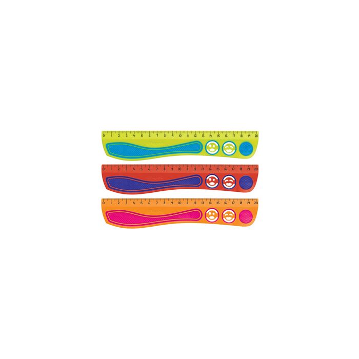 Maped Règle plate Kidy Grip, 200 mm, en plastique antidérapant, avc grands chiffres, avec visages à reproduireen plastique recyclable à 63%, anti-chocs, répartition en mm, sous carte blister, livré dans les couleurs assorties envert/bleu, orange/rose et rouge/lilas - pas de choix spécial de couleur! (278710)