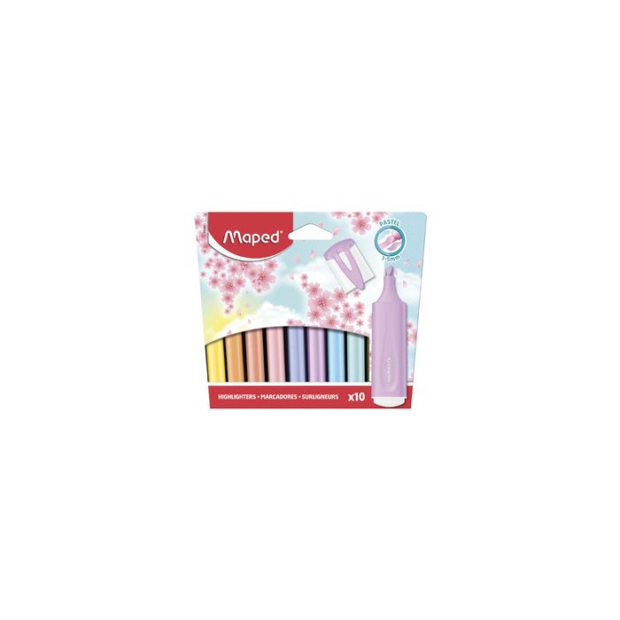 Maped Surligneur FLUO'PEPS PASTEL, blister de 10 pointe biseautée, épaisseur du trait: 1 - 5 mm, avec clip, pour papier, fax et papier pelure, assorti dans des tons pastel, contenu: 10 surligneurs (740903)
