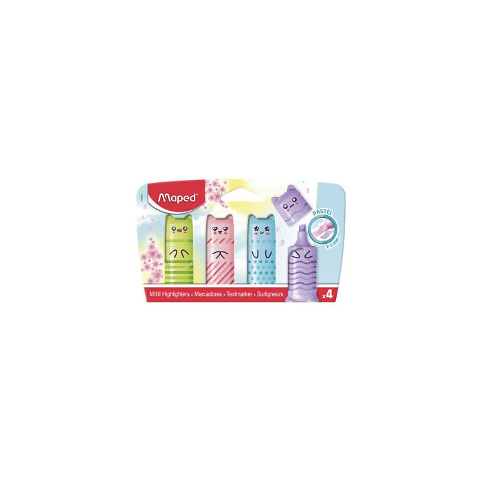 Maped Surligneur Mini PASTEL, blister de 4 impression de figures au design Kawai, format mini, pointe biseautée, largeur de tracé: 1,0 - 5,0 mm, assorti en bleu, vert, rose et lavande contenu : 4 pièces (743604)
