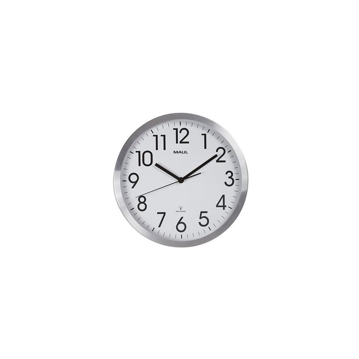 MAUL Horloge murale/horloge radio MAULmove, diamètre: 305 mmargent, synchronisation automatique, fonctionnement à pile, y compris une pile AA, cadre en aluminium brossé, chiffres noires, hauteur des chiffres: 35 mm, cadran en blanc (9063008)