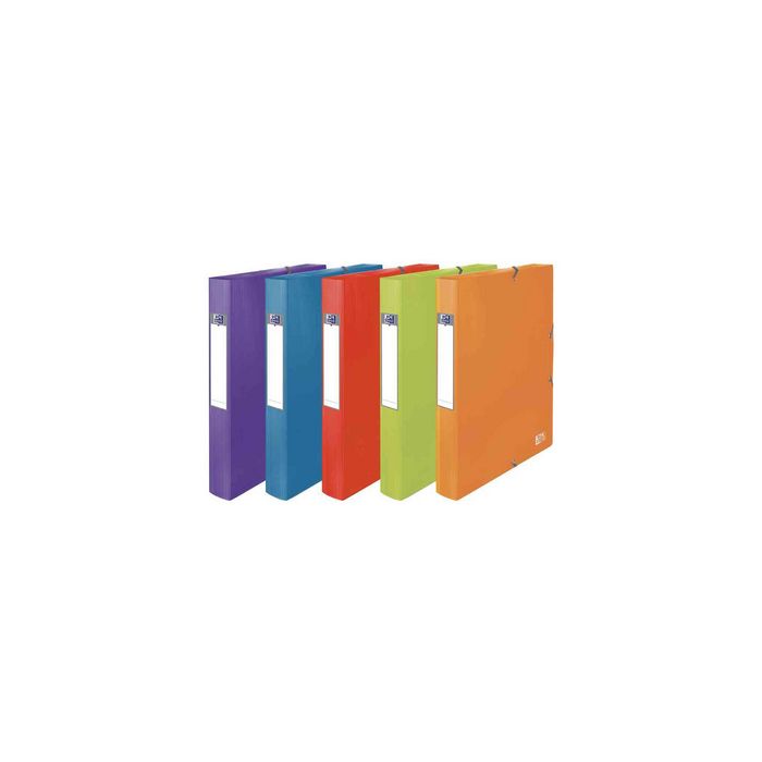 Oxford Boîte de rangement "School Life", dos: 40 mm, assortien PP, couvercle repliable, dos de 40 mm pour contenir jusqu'à 400 feuilles A4, avec étiquette adhésive, zone de préhension, élastique de fermeture, couleurs assorties, en paquet de 10 pièces (40006525) assorti dans les couleurs: rouge, orange, turquoise, violet,anis