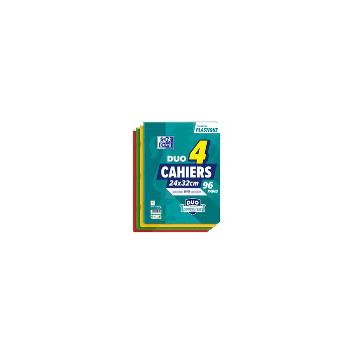 Oxford Cahier à pochettes DUO, 240 x 320 mm, seyès,pack de 4----------------- pour le marché: F ------------------------96 pages, papier 90 g/m2, extra blanc, qualité Optik Paper, couverture polypro, avec 2 pochettes transparentes, contenu: 4 cahiers (400183294) encoche anti-déchirure, découpe index, assorti dans les couleurs jaune, rouge, vert, turquoise
