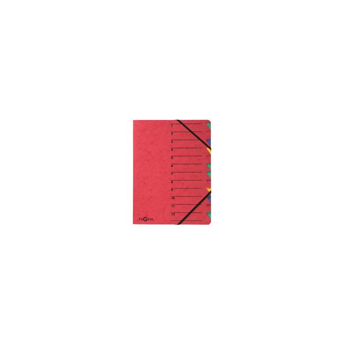 PAGNA trieur "EASY", A4, carton, 12 compartiments, rouge avec typographoe d'organistion sur la couverture avant 1-12,avec main de fichage colorée, avec 2 élastiques dans les coins, avec block interne coloré de grande qualité dimensions: (L)240 x (H)320 mm (24131-01)