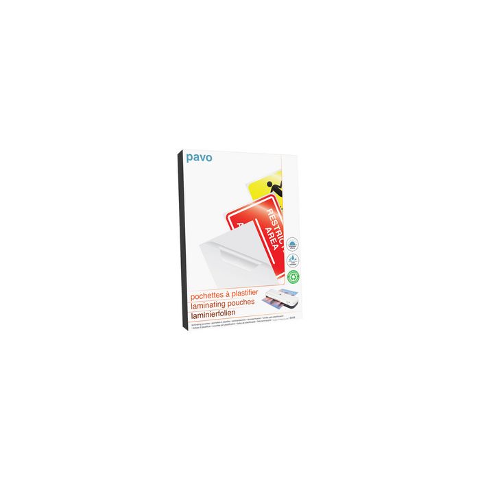 pavo Pochette de plastification, 67 x 99 mm, brillant 250 microns, 2 x 125 microns, polyéthylène (PET), couche collante issue d'une colle spéciale dans un rapport de mélange défini coins arrondis, plastification à chaud contenu: 100 pièces (8005994)