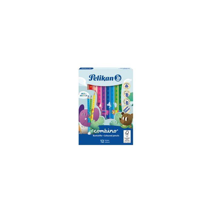 Pelikan Crayon couleur triangulaire combino, étui carton 12 longeur: 175 mm, diamètre de mine: 4,0 mm, corps épais, forme triangulaire ergonomique, mine douce de qualité, avec champ de personnalisation & motifs d'animaux à combiner contenu: 12 crayons (nouveau: 100401660 / ancien: 811194) assorti dans les couleurs jaune, orange, rouge, chair, rose,lilas, bleu foncé, bleu clair, vert clair, vert foncé, brun et noir