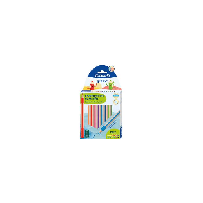Pelikan Crayon de couleur triangulaire griffix, étui de 12 étui carton, longueur: 140 mm, épaisseur de la mine: 4,0 mm,corps épais, forme triangulaire ergonomique, mine aquarellable, corps 100% bois contenu: 12 stylos (nouveau: 400198414 / ancien: 701525) assorti dans les couleurs: blush, jaune, orange, rouge, rose, violet, bleu moyen, bleu foncé, vert clair, vert moyen, marron et noir