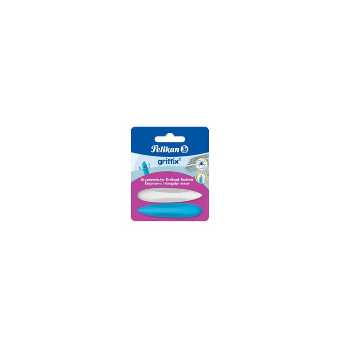 Pelikan Gomme triangulaire griffix, sur carte blister en plastique TPE, zone de préhension triangulaire pour maintien ergonomique comme un stylo, côté arrondi pour les grandes surfaces, côté pointu pour un effaçage précis contenu: 2 pièces (nouveau: 300007863 / ancien: 605311) assorti en blanc et bleu