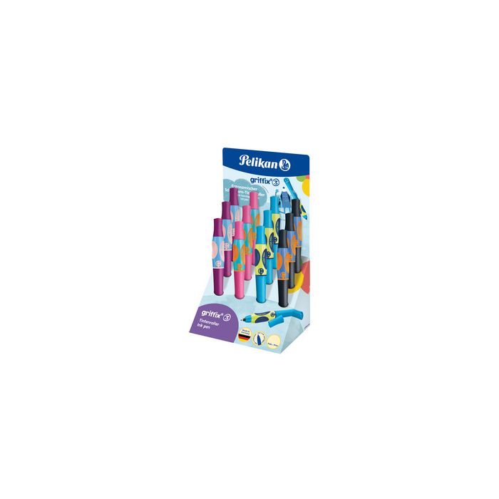 Pelikan Stylo à encre griffix, présentoir de comptoir stylo d'apprentissage de l'écriture avec un grip ergonomiquepour droitiers, couleur tracé: bleu, largeur tracé: 0,45 mm dimensions présentoir: (L)154 x (P)113 x (H)275 mm contenu: 12 stylos (nouveau: 300007867 / ancien: 605366) de couleurs assorties: 3 x Lovely Pink, Neon Fresh BLue, Sweet Berry et Neon Black