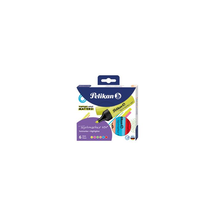 Pelikan Surligneur Textmarker 490, étui de 6, assorti encre universelle à base d'eau, pointe biseautée pour un marquage en 3 largeurs, poignée de préhension, capuchon Twist-Off, largeur de tracé : 1,0 - 5,0 mm contenu: 6 pièces (nouveau: 400195732 / ancien: 814065) assorti dans les couleurs jaune fluo, rose fluo, vert fluo, orange fluo, bleu fluo et rouge fluo
