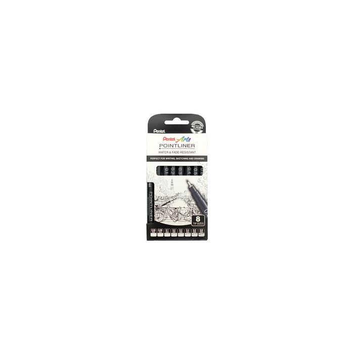 Pentel Feutre technique permanent Pointliner, set de 8, noirlargeur de tracé: de 0,03 à 0,8 mm, couleur de tracé: noir, pointe calibrée bagué métal, encre à pigments, résiste à l'eau et à la lumière contenu: 8 pièces (YS20P-8)