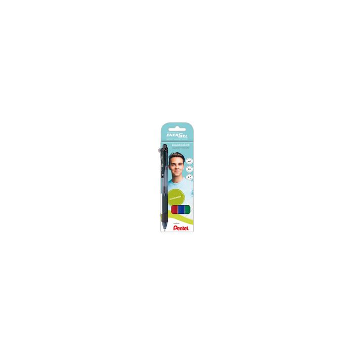 Pentel Roller encre gel liquide EnerGel-X BL107, étui de 4 largeur de tracé: 0,35 mm, diamètre de bille: 0,7 mm grip caoutchouté, corps en plastique avec clip en pastique couleur du corps: bleu, longueur d'écriture XXL, Recycology assortis dans les couleurs: bleu, rouge, vert et noir (BL107-4) dans un étui plastique transparent
