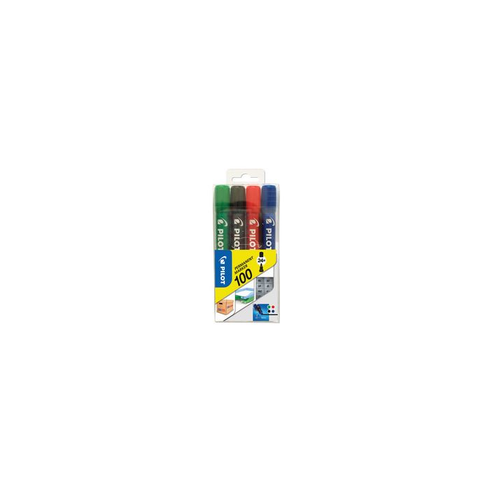 PILOT Marqueur permanent 100, pointe ogive, étui de 4 corps en plastique avec capuchon, largeur de tracé: 1,0 mm, séche instantanément, résiste à l'eau, à la lumière, au froid et à l'abrasion, assorti en noir, bleu, rouge, vert contenu: 4 marqueurs (501725 / SCA-100-SET4 / 4010S4) ne sèche pas jusqu'à 24 heures capuchon ouvert, haute résistance d'écriture