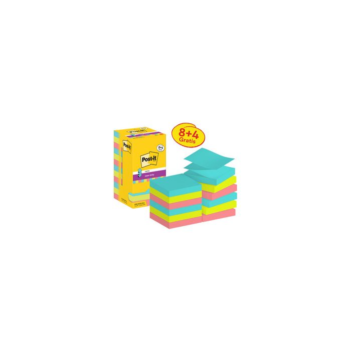 Post-it Bloc-note super sticky z-notes, 76 x 76 mm, 8+4 90 feuilles/bloc, promotion, Cosmic Collection: turquoise, vert fluo, rose tropical, forte adhérence, s'enlève sans laisser de traces, pour distributeur z-notes contenu: 12 blocs (R330-SSCOS-P8+4 / 7100290176 / BP1273)