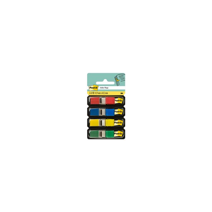 Post-it Marque-page Index mini, 11,9 x 43,2 mm, standard pour marquer et mettre en évidence, adhésion sûre, s'enlève sans laisser de trace, en film, en distributeur assorti dans les couleurs standard: rouge, bleu, jaune, vertcontenu: 4x 35 marque-pages (683-4 / 7000144923)