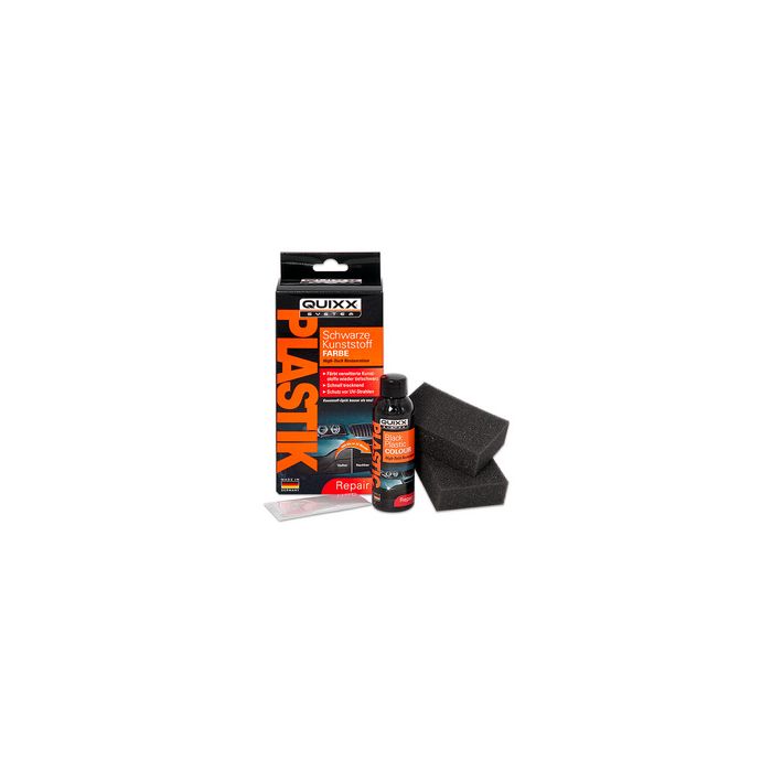 QUIXX Peinture pour plastique, noir colore les plastiques ternis et gris en noir profond, sèche rapidement, ne colle pas, n'attire pas la poussière, tient jusqu'à 12 mois, très économique (2 véhicules env.) (20146) contenu: 1x colorant concentré, 2x éponges pour l'application, 1 paire de gants de protection
