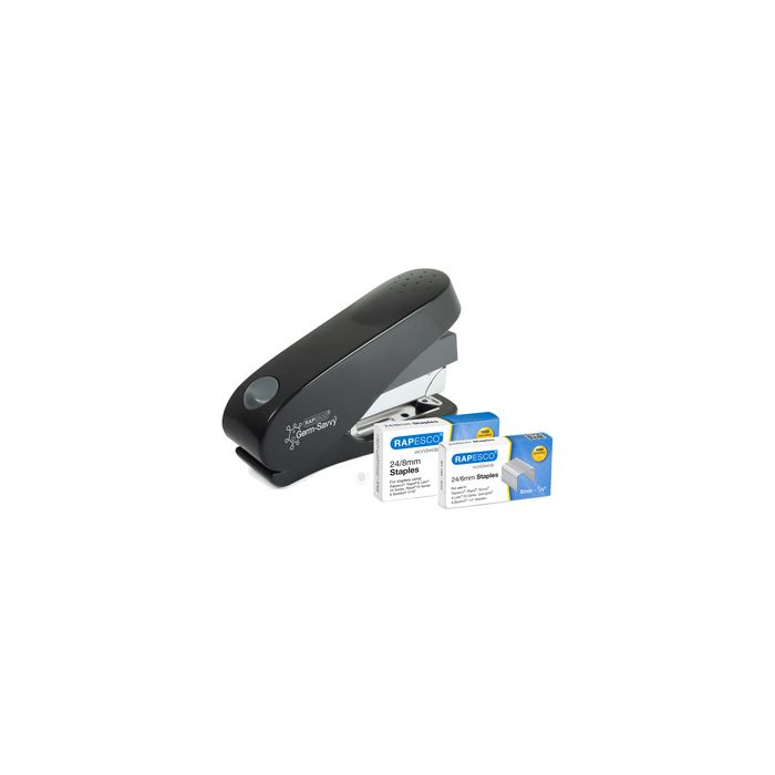 RAPESCO Agrafeuse ECO Luna - Less Effort, noir capacité d'agrafage: 50 feuilles, profondeur de gorge: 70 mmagrafeuse demi-bande, chargement frontal avec bouton d'éjection, agrafer avec 50% d'effort en moins, avec plastique recyclé, pour agrafes 24/6-8 et 26/6-8 mm (1466) avec 1000 agrafes x 24/8 et 1000 agrafes x 24/ 6 mm avec protection antibactérienne