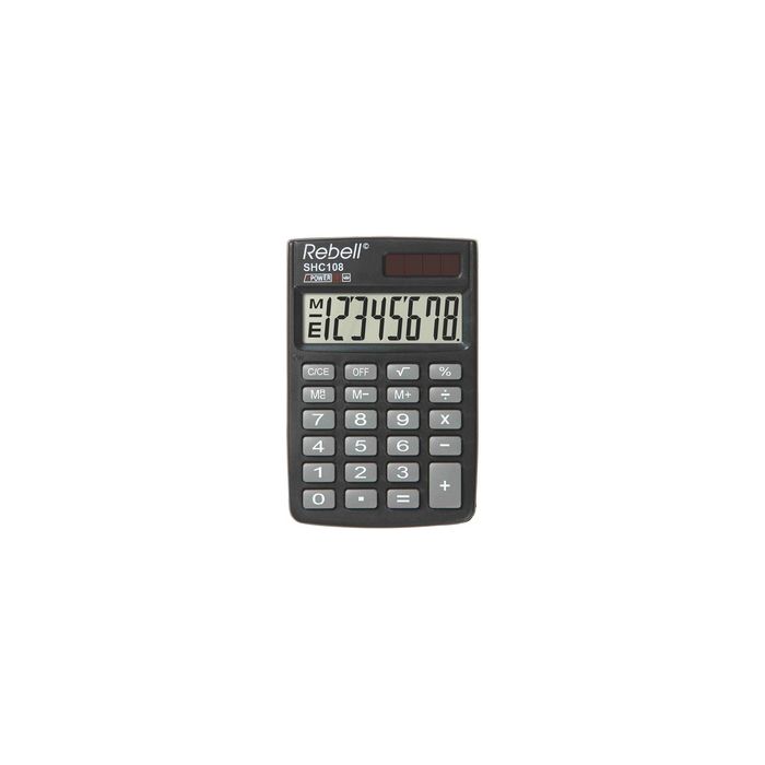 Rebell Calculatrice de poche SHC 108, noir affichage LC à 8 chiffres, fonctionne avec pile/solaire, opérations arithmétiques de base, calcul de pourcentage, fonction mémorisation, dimensions: (L)59 x (P)88 x (H)10 mm,poids : 32 g (RE-SHC108)
