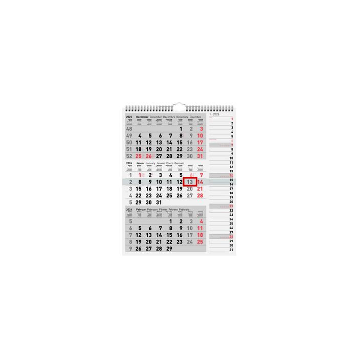 rido idé Calendrier mural 3 mois "Kombi Planer 3", 2026 dimensions feuille: 300 x 390 mm, calendrier: 3 mois sur 1 page, impression: noir/rouge, reliure spirale, en 4 langues:allemand, anglais, français, néerlandais, fond gris, avec calendrier du mois en cours sur le côté droit (7033330003) papier: 100 g/m2, papier offset, blanchi sans chlore