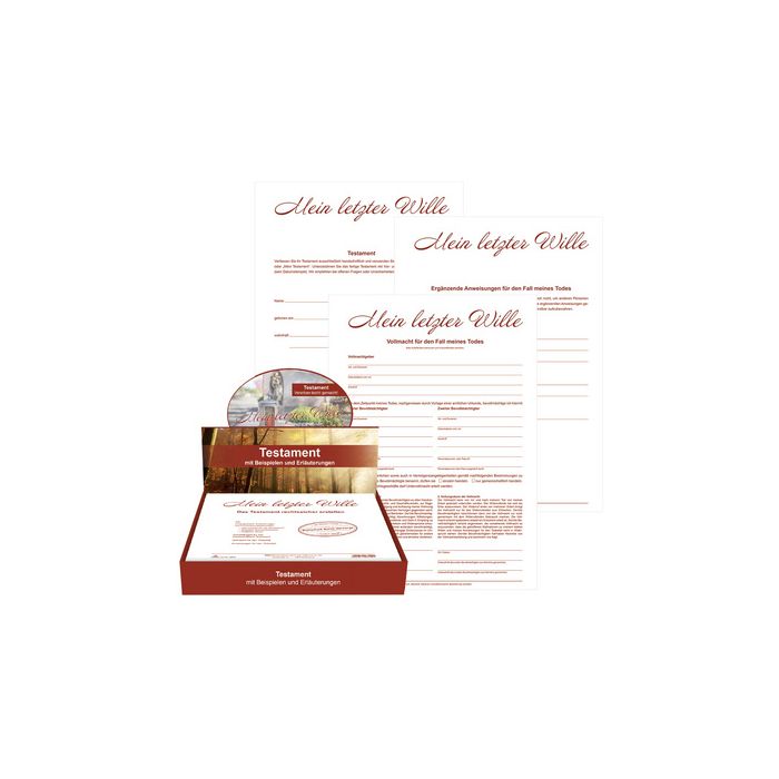 RNK Verlag Vordruck Testament "Mein letzter Wille", Display --------------------- Für den Markt: D -------------------- Format: 220 x 162 mm, Beispiele für Formulierungen, erläutert Erbschaftssteuer und Erbfolge gepackt zu 10 Packungen à 10 Sätze (2812) Inhalt: 1 x Schreibbogen für das handschriftliche Testament,Anweisungen für den Todesfall, 1 x Vollmacht für den Todes- fall, umfangreiche Erläuterungen mit hilfreichen Formulierungsbeispielen