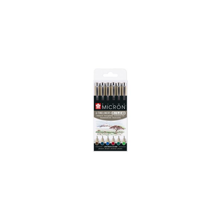 SAKURA Feutre fin PIGMA MICRON 05, couleur terre, étui de 6 largeur de tracé: 0,45 mm, permanent, couleur résistante, résiste à l'eau et à la lumière, pour dessiner et illustrer contenu: 6 pièces (POXSDK056B) assorti dans les couleurs: sepia, bleu-noir, bleu royal, bordeaux, vert chasseur, vert frais