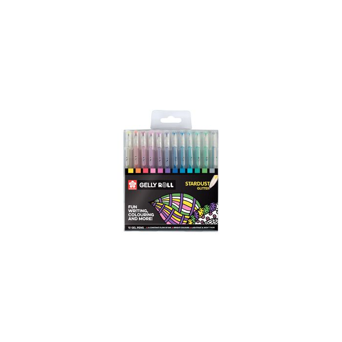 SAKURA Stylo roller encre gel Gelly Roll Stardust étui de 12couleurs assorties, effets brillants et irisés, écriture fluide, flux de l'encre continu sans pression, séchage rapi-de, étui en plastique contenu : 12 pièces (POXPGBSTA12) idéal pour dessiner, pour le journaling, pour décorer et écrire