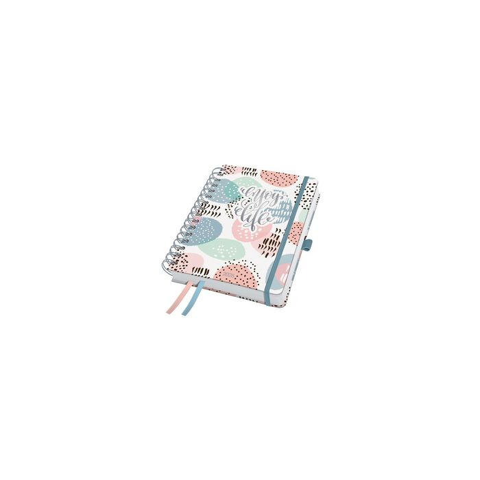 sigel Agenda planning Jolie "Rose Inspiration" 2026, A5 semainier avec spirale intégrale, 168 x 215 mm, 1 semaine / 2 pages, 240 pages dont 16 perforées, 120 g/m2, couverture rigide en textile avec design de marques de pinceau et motif"Enjoy Life", avec pages d'informations, (J6602) pages de motifs et pages de planning, fermeture à élastique, dans les langues: DE/GB/FR/NL