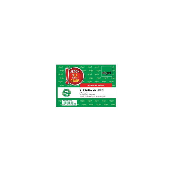 sigel Formularbuch "Quittung", 2 + 1 Aktion ---------------------- für den Markt: D --------------------mit MwSt.-nachweis, A6 quer, SD, selbstdurchschreibend, 1. und 2. Blatt bedruckt, mit Sicherheitsdruck, 3 ST, Mikroperforation und Abheftlochung beinhaltet: 3 Stück (T1178)