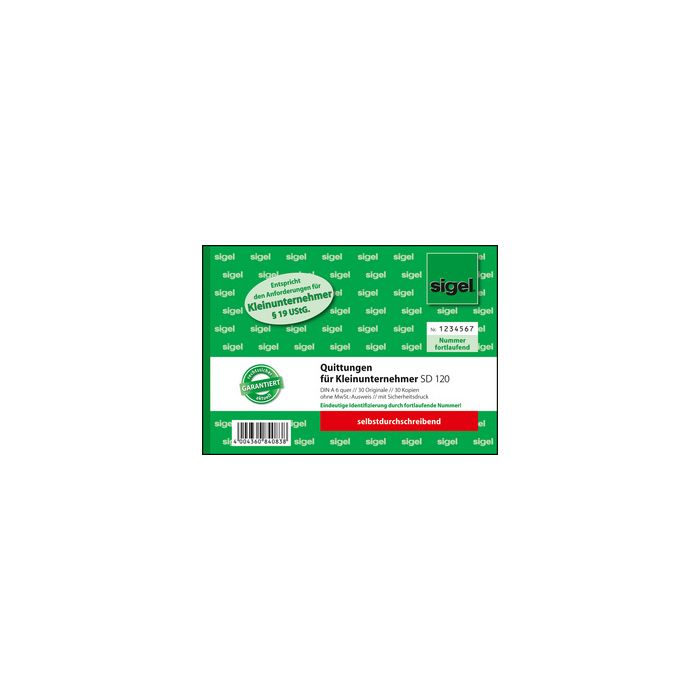 sigel Formularbuch "Quittung" für Kleinunternehmer ---------------------- für den Markt: D --------------------ohne MwSt.-Ausweis, A6 quer, mit Sicherheitsdruck, 1. und 2. Blatt bedruckt, SD, 2 x 30 Blatt, mit vorge- druckter 7-stelliger Nummer zu eindeutigen Identifizierung (SD 120) alle Blätter mit Abheftlochung und Microperforation, mit integrierter Schreibunterlage zum Einklappen