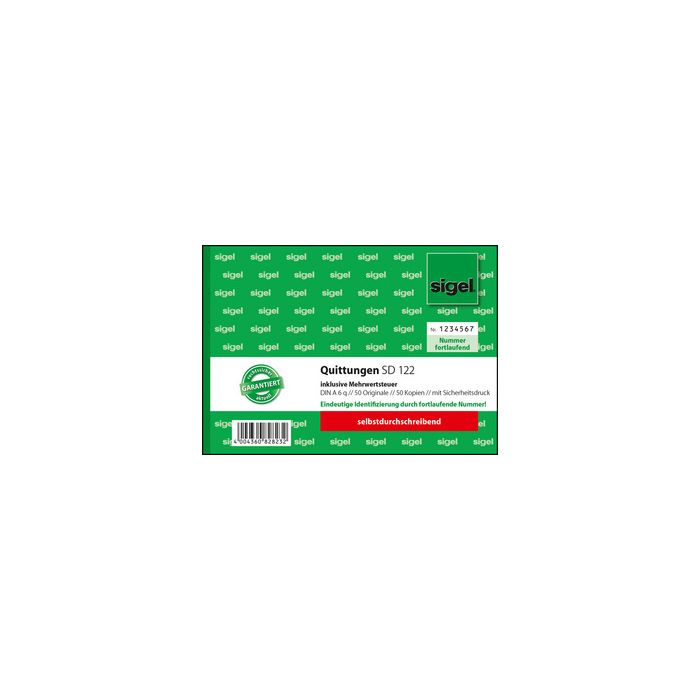 sigel Formularbuch "Quittung", inkl. MwSt., DIN A6 quer ---------------------- für den Markt: D --------------------100 Blatt, selbstdurchschreibend, mit vorgedruckter 7-stelliger Nummer, fälschungssicher, Kopien in blanko gelb Inhalt: 2 x 50 Blatt (SD122)