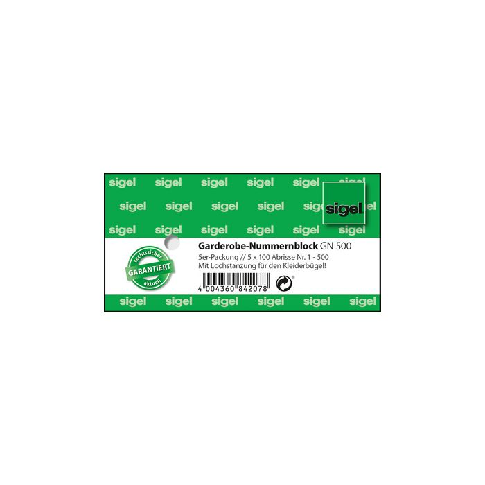 sigel Nummernblock "Garderobe", 1-500, (B)105 x (H)50 mm mit Lochstanzung für Kleiderbügel, jeder Block enthält 100 Abrisse, mit Schnitt-Steg-Perforation, farbig sortiert in den Farben: blau oder gelb - kein Farbwunsch möglich beinhaltet: 5 Blöcke (GN500)